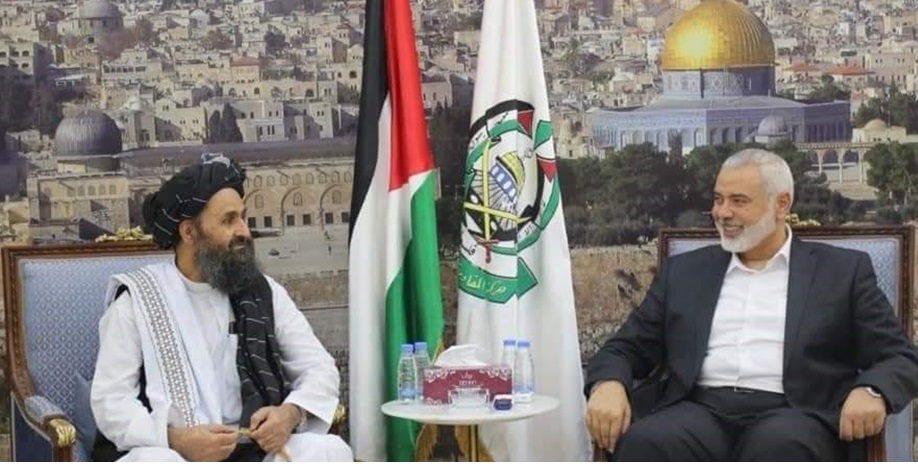 دیدار ملا "عبدالغنی برادر" رئیس وقت کمیسیون سیاسی طالبان با "اسماعیل هنیه" رئیس دفتر سیاسی جنبش حماس در شهر دوحه قطر در سال ۱۴۰۰ (پیش از به قدرت رسیدن طالبان)